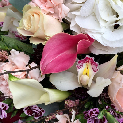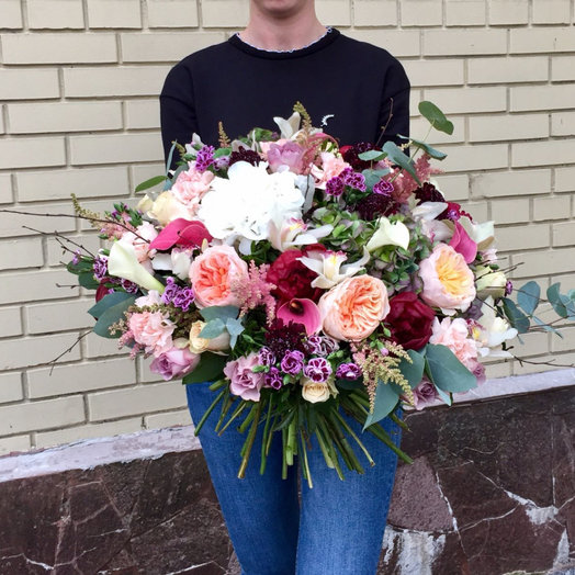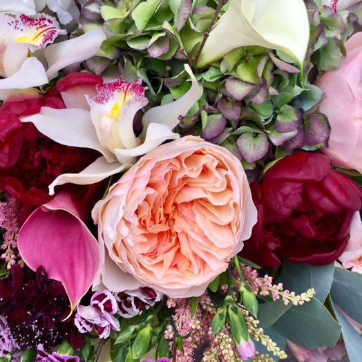 О чем мечтают женщины? Уже много поколений мужчин ищут ответ на этот философский вопрос. А нашим флористам ответ на него дается очень легко: каждая девушка мечтает получить неповторимый роскошный букет, который будет дарить улыбку и вызывать зависть подружек. Проверено! Именно букет «Мечты Алисы» может исполнить все желания и стать незабываемым подарком для самой искушенной дамы.В прочем, этот букет не так уж прост! Он создан в двух вариациях: с упаковкой и в естественном зеленом обрамлении растений. И прекрасно подойдет и для мужчины, которому будет напоминать о любимой женщине, ее тонком вкусе, красоте и нежных чувствах.В составе букета: чарующий пион Red Charm с глубокими оттенками, элегантные одноголовые розы с нежными лепестками, красивые каллы с изящными формами, пышные соцветия астильбы, напоминающая солнце гортензия, романтичная английская роза Juliet, яркая живописная скабиоза, самая красивая орхидея цимбидиум и известная всему миру очаровательная гвоздика. Украшают букет эвкалипт цинерея, писташ и ветки гагеля.Этот шикарный букет мы доставляем в специальном пластиковом контейнере, наполненном специальным обогащенным витаминами раствором. Мы рекомендуем не оставлять цветы в пластиковой вазе, а по возможности переставить в чистую свежую воду и стеклянную вазу в домашних условиях. Так вы сохраните красоту букета гораздо дольше!Высота букета – 50 см, ширина – 60 см Доставка цветов. Заказать цветы недорого. С любовью к Вам и к цветам, команда Зеленая лиса.