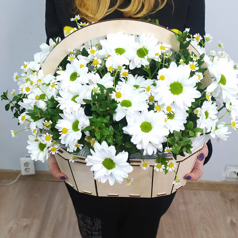 Пышная, ароматная и корзина из полевой ромашки и хризантемы. Она восхитительна и однозначно порадует получателя! Доставка цветов. Заказать цветы недорого. С любовью к Вам и к цветам, команда Зеленая лиса.