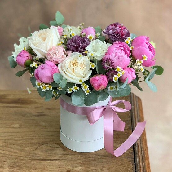 Шляпная коробочка с пионовидной розой и пионами Доставка цветов. Заказать цветы недорого. С любовью к Вам и к цветам, команда Зеленая лиса.