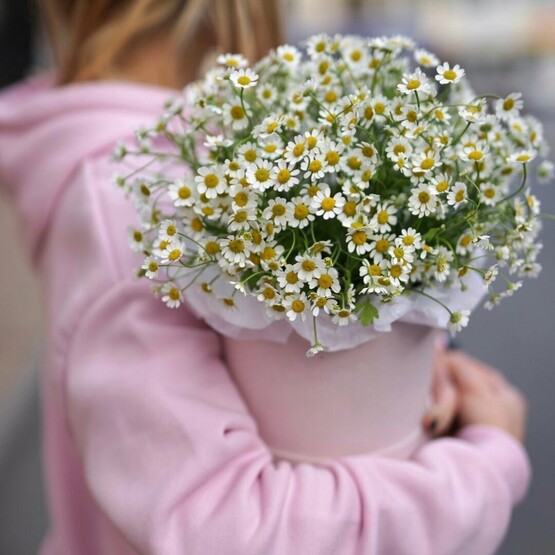 Композиция из полевых ромашек в шляпной коробке с атласными лентами Доставка цветов. Заказать цветы недорого. С любовью к Вам и к цветам, команда Зеленая лиса.