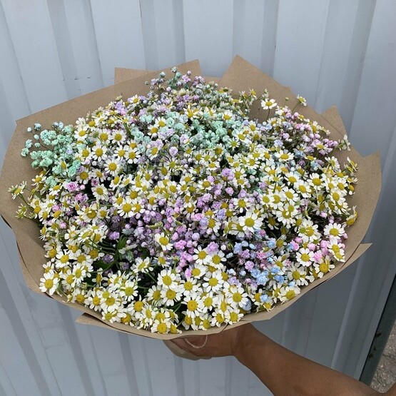 Радужный букет из красивых ромашек и гипсофил. Доставка цветов. Заказать цветы недорого. С любовью к Вам и к цветам, команда Зеленая лиса.