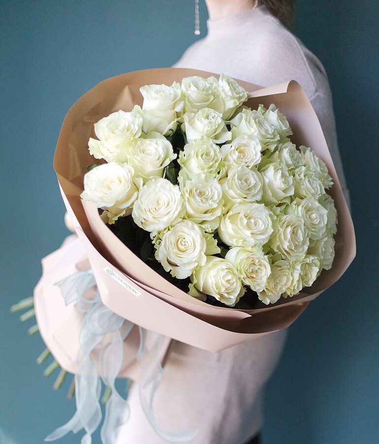 Классический букет из белых роз в нежно-розовой упаковке. Доставка цветов. Заказать цветы недорого. С любовью к Вам и к цветам, команда Зеленая лиса.
