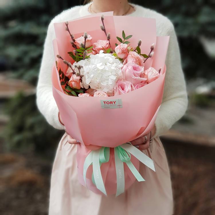Состав: гортензия, роза кустовая, роза импортная, ветки декоративной вербы (котики), фисташка, упаковка Доставка цветов. Заказать цветы недорого. С любовью к Вам и к цветам, команда Зеленая лиса.