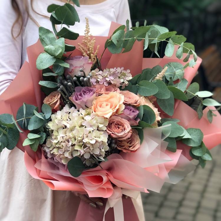 Состав: гортензия, бруния, эвкалипт, астильба, роза, упаковка Доставка цветов. Заказать цветы недорого. С любовью к Вам и к цветам, команда Зеленая лиса.