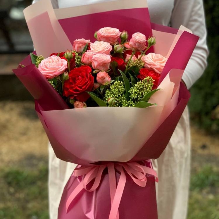Состав: роза, скимия, роза спрей, лента, упаковка. Доставка цветов. Заказать цветы недорого. С любовью к Вам и к цветам, команда Зеленая лиса.