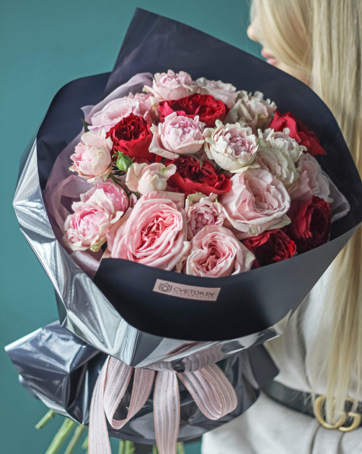 Букет из роз премиум класса. В составе ароматная пионовидная роза Пинк Охара, романтичная роза Дэвида Остина Тесс и кружевная роза Кенди Флоу. Доставка цветов. Заказать цветы недорого. С любовью к Вам и к цветам, команда Зеленая лиса.