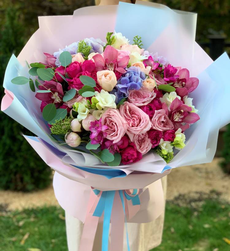 Состав: гортензия, роза, фрезия, скимия, эвкалипт, орхидея, пион, лента, упаковка Доставка цветов. Заказать цветы недорого. С любовью к Вам и к цветам, команда Зеленая лиса.