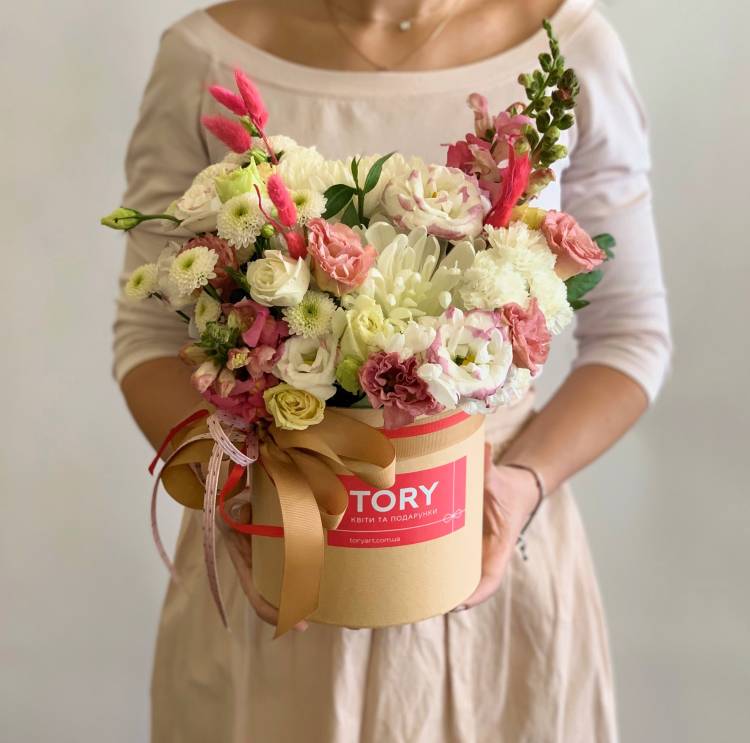 Состав: хризантема, эустома, антиринум, гвоздика, лента, коробка Доставка цветов. Заказать цветы недорого. С любовью к Вам и к цветам, команда Зеленая лиса.