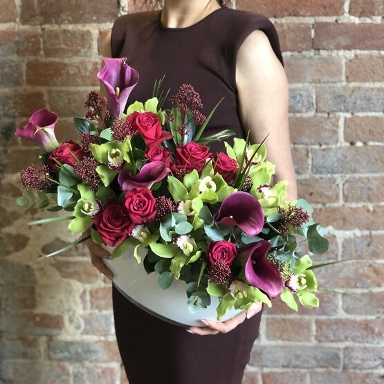Стильная композиция в вазе с каллами и орхидеей, украсит собой любое торжество. Доставка цветов. Заказать цветы недорого. С любовью к Вам и к цветам, команда Зеленая лиса.