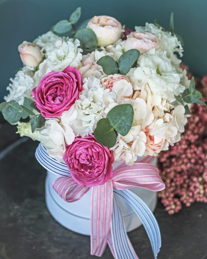 Нежная композиция в шляпной коробке с яркими акцентами. В составе: гортензия, лизиантус, кустовая роза Мисти Баблз, кустовая роза Мэнсфильд Парк Доставка цветов. Заказать цветы недорого. С любовью к Вам и к цветам, команда Зеленая лиса.