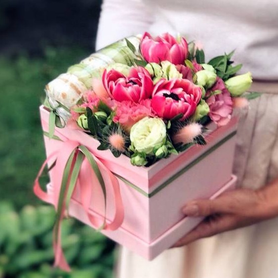 Состав: эустома, пион, вибурнум, гвоздика, коробка, макаруны Доставка цветов. Заказать цветы недорого. С любовью к Вам и к цветам, команда Зеленая лиса.
