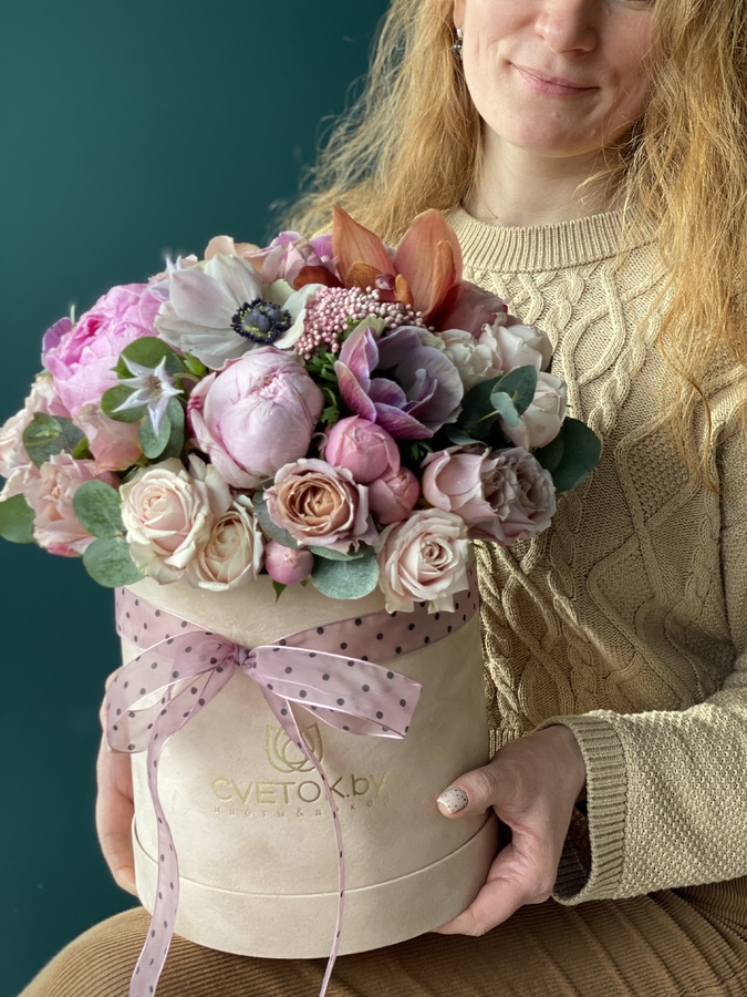 Композиция в бархатной коробке песочного цвета. В составе: пионы, анемоны, клематис, орхидеи, кустовая роза. Доставка цветов. Заказать цветы недорого. С любовью к Вам и к цветам, команда Зеленая лиса.