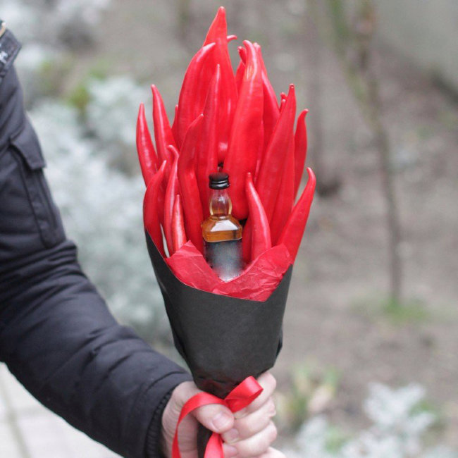 Хочется удивить мужчину, лучшего друга необычным подарком. Букет из перцев станет отличным дополнением к подарку. Возможно добавление и оформление Ваших привезенных напитков и подарков. Если вы хотите использовать алкогольную продукцию в композиции, то вам необходимо приобрести ее самостоятельно и предоставить нам для дальнейшего оформления. Мы не занимаемся реализацией и доставкой алкогольной продукции. Доставка цветов. Заказать цветы недорого. С любовью к Вам и к цветам, команда Зеленая лиса.