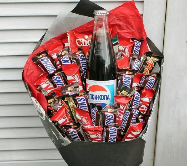 Самый неожиданный сладкий подарок не только для подростка, но и родителей, которые любят побаловать себя шоколадками и колой. Доставка цветов. Заказать цветы недорого. С любовью к Вам и к цветам, команда Зеленая лиса.