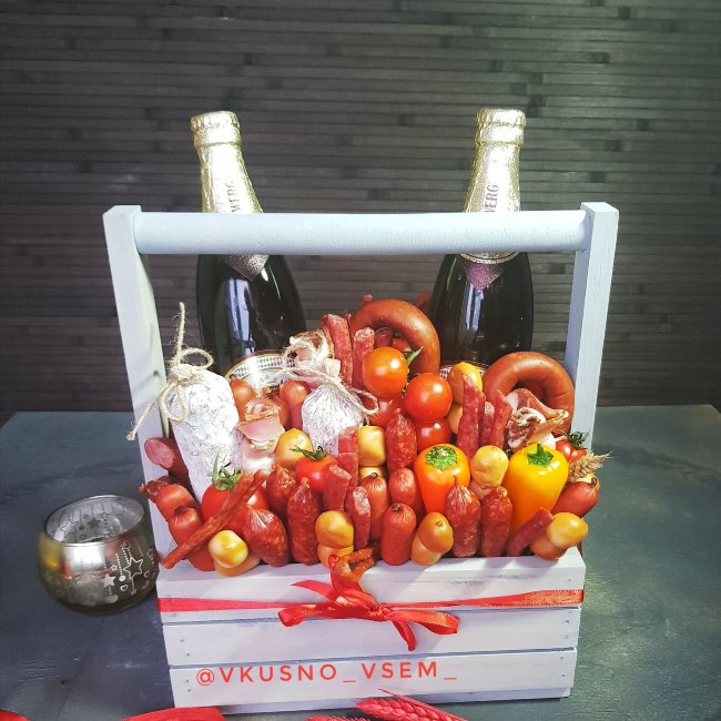 Доставка цветов в Карачаевске » Фруктовый букет » Ящик с колбасой и сыром «Так надо»