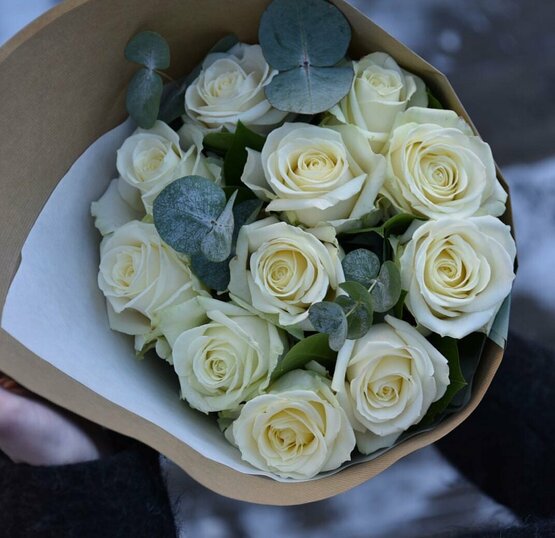 Букет из белых роз, выращенных в теплицах россии с ароматными веточками эвкалипта.. Розы упакованы в классический крафт бумагу. Доставка цветов. Заказать цветы недорого. С любовью к Вам и к цветам, команда Зеленая лиса.