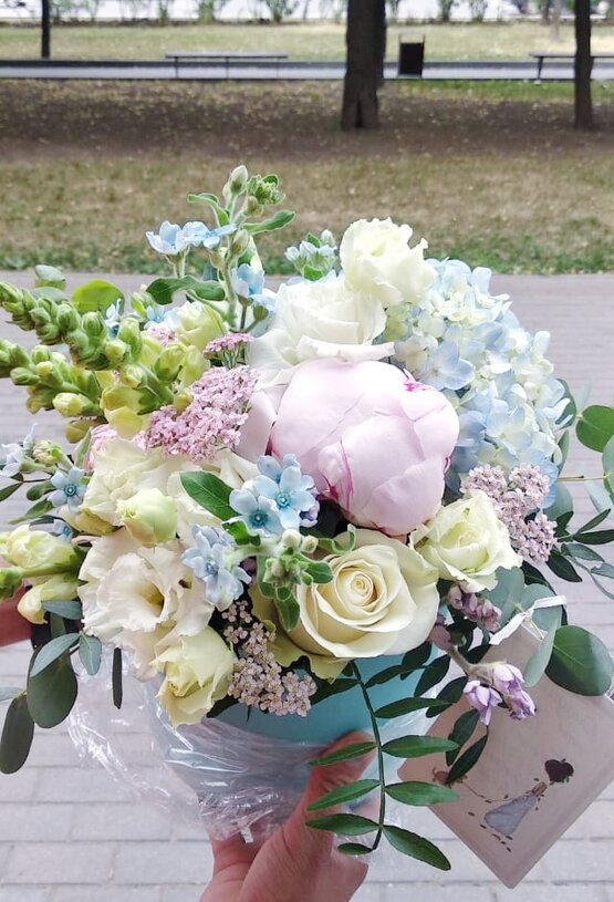 Цветы в шляпной коробке.размер коробки: 16х15 см Доставка цветов. Заказать цветы недорого. С любовью к Вам и к цветам, команда Зеленая лиса.
