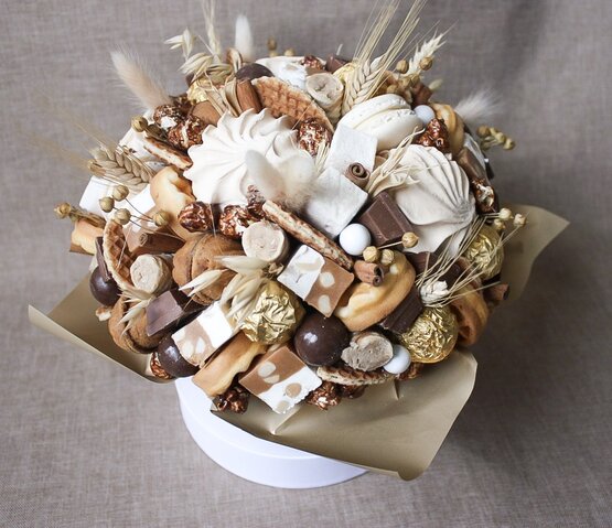 Шляпная коробка с удивительным букетом из всевозможных сладостей Доставка цветов. Заказать цветы недорого. С любовью к Вам и к цветам, команда Зеленая лиса.