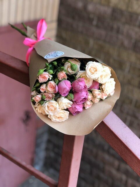 Микс кустовых роз в крафт бумаге с атласной лентой. Доставка цветов. Заказать цветы недорого. С любовью к Вам и к цветам, команда Зеленая лиса.