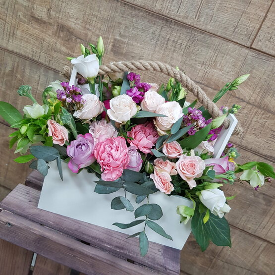 На смену композициям в корзинах пришли ящички. очень современно и по-настоящему красиво. пионовидная роза добавляет нотки прованса и действительно очаровывает. наш салон специализируется на создании авторских букетов и композиций, поэтому мы не делаем букеты под копирку, каждый букет индивидуален, как и его обладательцвет желаемого ящика указывайте в комментариях Доставка цветов. Заказать цветы недорого. С любовью к Вам и к цветам, команда Зеленая лиса.
