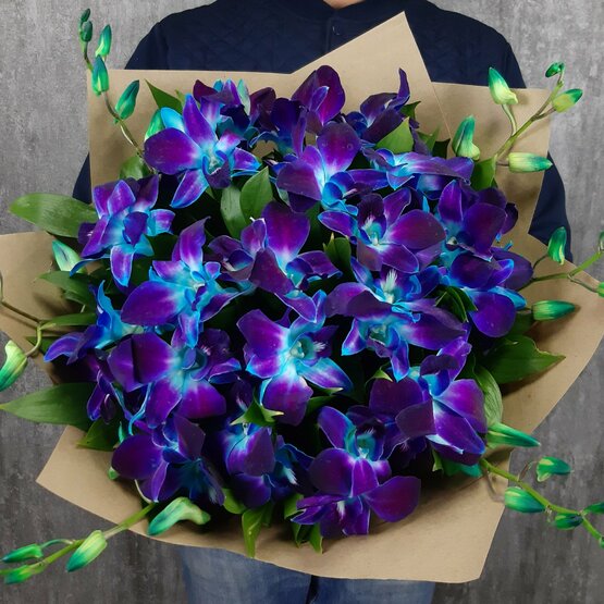 Яркий космический букет из синих орхидей в крафтовой упаковке. Доставка цветов. Заказать цветы недорого. С любовью к Вам и к цветам, команда Зеленая лиса.