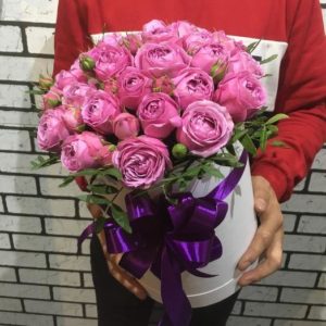 Пионовидные розы Мисти Баблс в шляпной золотой коробочке