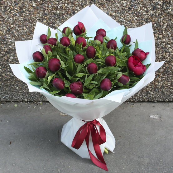Букет из 25 красных пионов Доставка цветов. Заказать цветы недорого. С любовью к Вам и к цветам, команда Зеленая лиса.