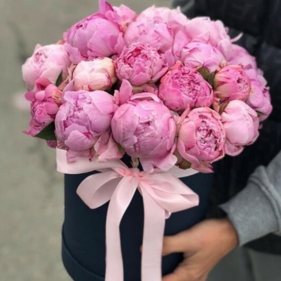 Букет из роскошных и крупных розовых пионов, бутон к бутону, в контрастной и стильной черной в шляпной коробке выглядит просто великолепно! сделайте свое признание в любви незабываемым и нежным, теплым и наполненным летним ароматным волшебством! Доставка цветов. Заказать цветы недорого. С любовью к Вам и к цветам, команда Зеленая лиса.
