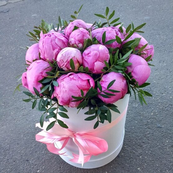 Гарантируем свежесть цветов, доставка от двух часов!!! Чудесный букет из розовых пионов в белой шляпной коробке напомнит прекрасной особе о ее исключительной красоте, нежности и очаровании. Ароматные летние цветы цвета сладкого клубничного мороженого помогут передать все оттенки любви дарителя! Доставка цветов. Заказать цветы недорого. С любовью к Вам и к цветам, команда Зеленая лиса.