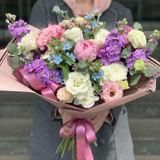 Ароматный букет с пионом, маттиолой, эустомой Доставка цветов. Заказать цветы недорого. С любовью к Вам и к цветам, команда Зеленая лиса.