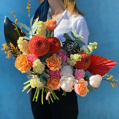 Поистине, королевский букет состоящий из ароматных пионов, крупных георгинов, роскошной пионовидной розы и ягодного вибурнума в окружении душистого эвкалипта. Доставка цветов. Заказать цветы недорого. С любовью к Вам и к цветам, команда Зеленая лиса.