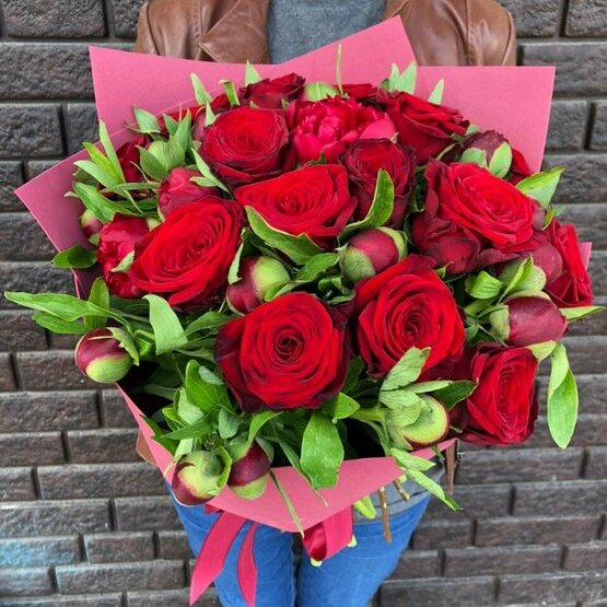 Яркий и ароматный букет из пионов и роз – отличный подарок для милой леди! Доставка цветов. Заказать цветы недорого. С любовью к Вам и к цветам, команда Зеленая лиса.