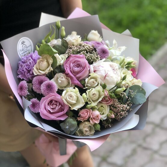 Нежный букет с пионом, розами и эвкалиптом. Приятное цветовое сочетание без излишеств. Сезонный пион – сердце букета. Непромокаемая упаковка из двух видов двухцветной пленки. Подарите хорошее настроение близкому человеку, а мы донесем ваши слова поздравления до получателя. Доставка цветов. Заказать цветы недорого. С любовью к Вам и к цветам, команда Зеленая лиса.