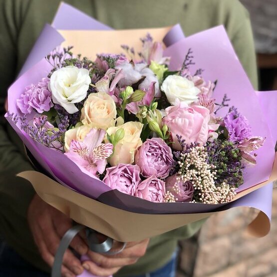 Прекрасный букет с пионом преимущественно лавандовых и розовых тонов. Доставка цветов. Заказать цветы недорого. С любовью к Вам и к цветам, команда Зеленая лиса.