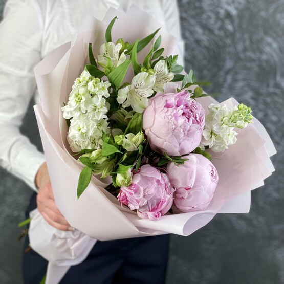 Романтичный и милый букет мисс пиони. Непревзойденные шапки французских пионов нежно сочетаются с белоснежной маттиолой. Доставка цветов. Заказать цветы недорого. С любовью к Вам и к цветам, команда Зеленая лиса.