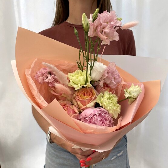 Нежная композиция из пионов и не только – прекрасный вариант для букета-комплимента «без повода». Доставка цветов. Заказать цветы недорого. С любовью к Вам и к цветам, команда Зеленая лиса.