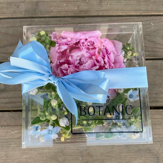 Пион «сара бернар» с оксипеталумом в прозрачном боксе Доставка цветов. Заказать цветы недорого. С любовью к Вам и к цветам, команда Зеленая лиса.