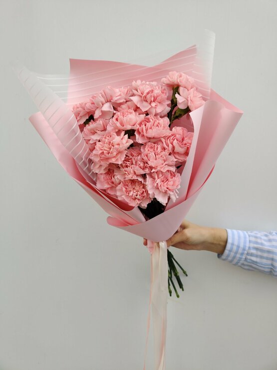 Монобукет из 19 диантусов в дизайнерской упаковке с атласными лентами Доставка цветов. Заказать цветы недорого. С любовью к Вам и к цветам, команда Зеленая лиса.