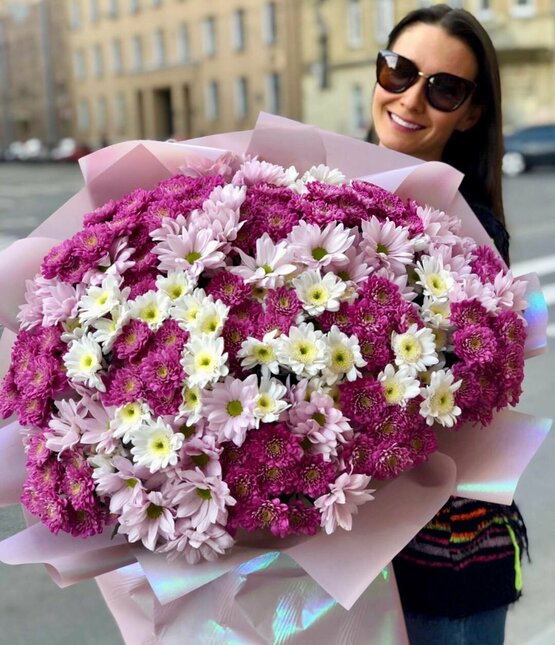 Монобукет из 25 кустовых хризантем в дизайнерской упаковке с атласными Доставка цветов. Заказать цветы недорого. С любовью к Вам и к цветам, команда Зеленая лиса.