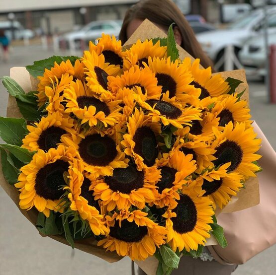 Монобукет из 25 подсолнухов в дизайнерской упаковке с атласными лентами Доставка цветов. Заказать цветы недорого. С любовью к Вам и к цветам, команда Зеленая лиса.