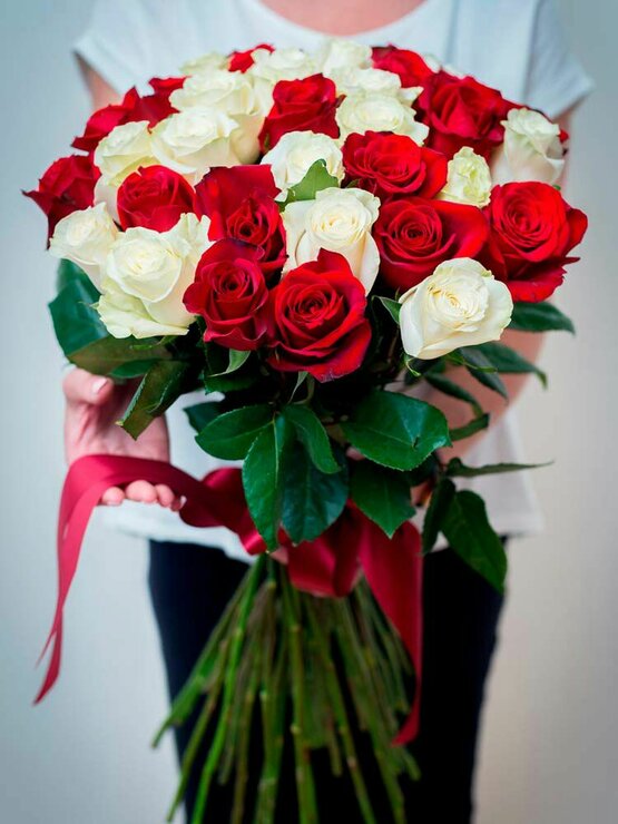 Шикарный букет из красных и белых крупных роз. Дополнительно к букету можно заказать леденец с открыткой. Для заказа леденца укажите это в комментариях. Доставка цветов. Заказать цветы недорого. С любовью к Вам и к цветам, команда Зеленая лиса.