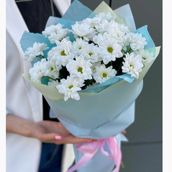 Монобукет из 5 кустовых хризантем в дизайнерской упаковке Доставка цветов. Заказать цветы недорого. С любовью к Вам и к цветам, команда Зеленая лиса.