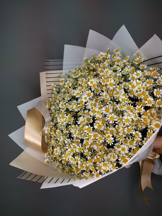 Воздушный и летний букет ромашек камилла в сочетании с лёгкой корейской пленкой лаконичных оттенков. Доставка цветов. Заказать цветы недорого. С любовью к Вам и к цветам, команда Зеленая лиса.