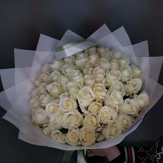 Роскошный букет из белых роз в корейской матовой пленке, украшенный атласными лентами. Доставка цветов. Заказать цветы недорого. С любовью к Вам и к цветам, команда Зеленая лиса.