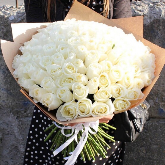 Классический букет из 99 белых розы сорта аваланж. уход заключается в ежедневной подрезке стеблей, замене воды в вазе и размещении в дали от тепловых приборов и прямых солнечных лучей. Доставка цветов. Заказать цветы недорого. С любовью к Вам и к цветам, команда Зеленая лиса.