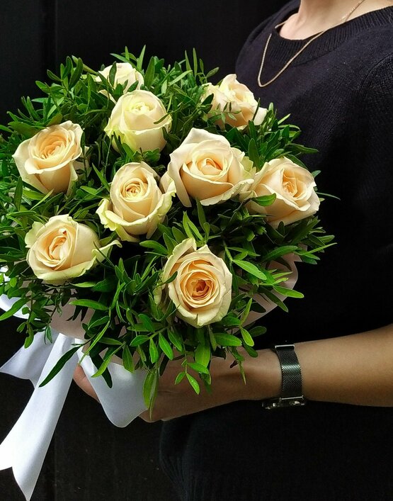 Очаровательный букет-комплимент в шляпной коробке из одноголовых роз светлого оттенка и веточек писташи. Доставка цветов. Заказать цветы недорого. С любовью к Вам и к цветам, команда Зеленая лиса.