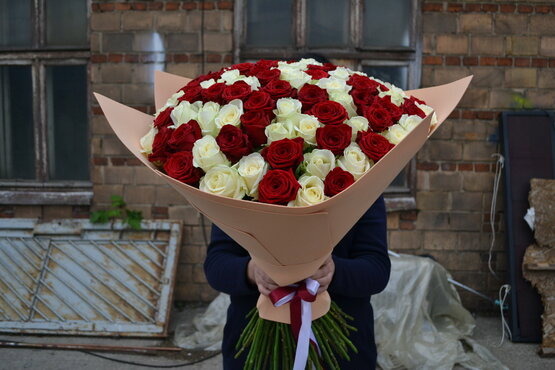 Букет красных и белых розкомпозиция состоит из 101 красной и белой розы 70 см. Такой букет — отличный презент для девушки или женщины. Эти цветы можно дарить по любому поводу: на день рождения, годовщину или на свидании. Подарок смотрится роскошно и объемно. Благодаря надежной фиксации флористической лентой, ни один элемент не выбивается из общей концепции, а сама композиция выглядит целостно. Это решение, которому под силу по-настоящему удивить получателя. «богиня» сделает важный для вас … Доставка цветов. Заказать цветы недорого. С любовью к Вам и к цветам, команда Зеленая лиса.