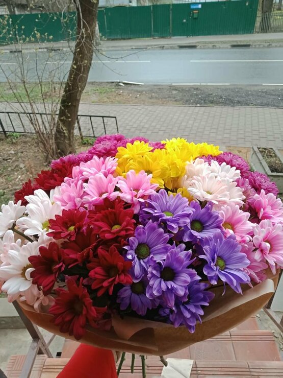 Яркий букетик разных цветов и сортов хризантем Доставка цветов. Заказать цветы недорого. С любовью к Вам и к цветам, команда Зеленая лиса.
