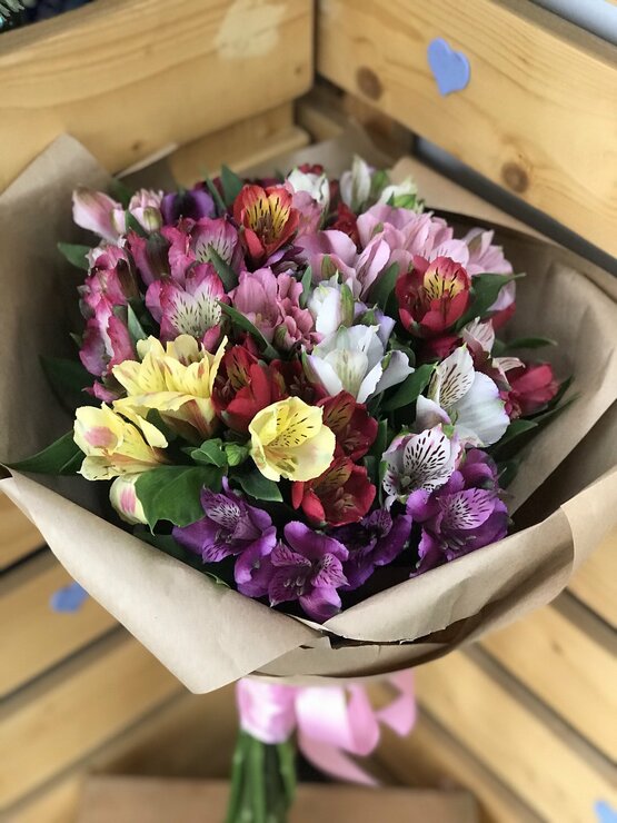 15 цветных альстромерий в крафте никого не оставят равнодушным! Доставка цветов. Заказать цветы недорого. С любовью к Вам и к цветам, команда Зеленая лиса.
