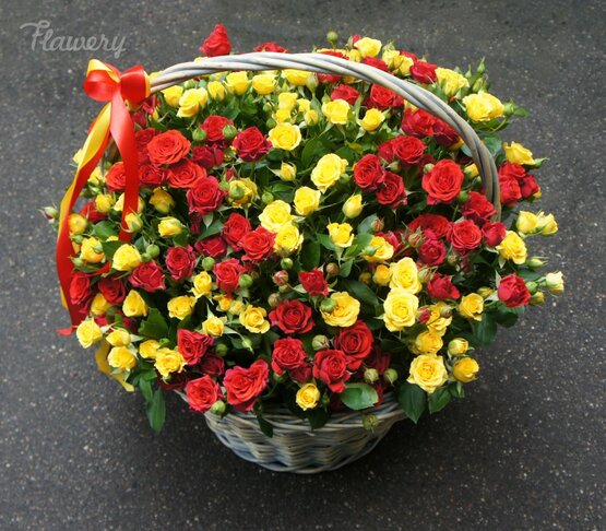 Корзина из 51 кустовой розы ярких оттенков — по истине запоминающийся подарок на любой случай жизни!!! Доставка цветов. Заказать цветы недорого. С любовью к Вам и к цветам, команда Зеленая лиса.